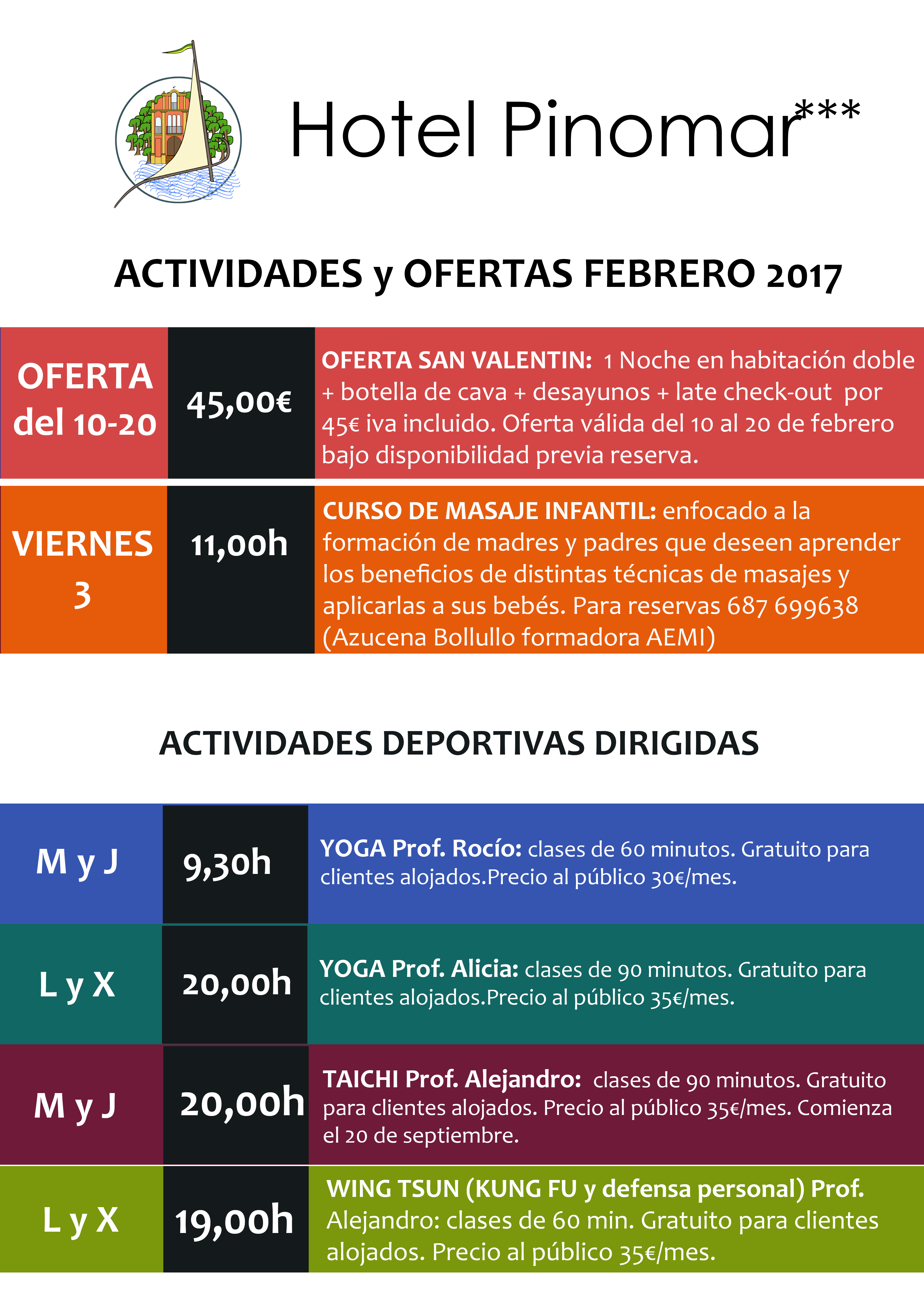 Os dejamos un pequeño resumen de nuestras actividades y ofertas para el mes de febrero. ¡Esperamos veros por Pinomar!
