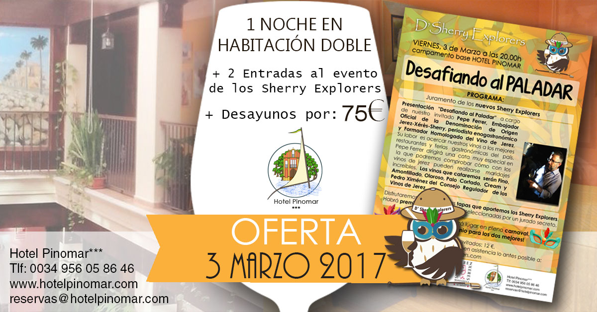 ¡El próximo viernes 3 de marzo tendremos un nuevo evento de los Sherry Explorers, “Desafiando al Paladar”! Con una oferta muy especial de alojamiento + entradas para todo aquel que quiera asistir. Pepe Ferrer, periodista enograstronómico, será la persona que nos guiará por este maridaje de sabores inesperados. ¡Os esperamos!