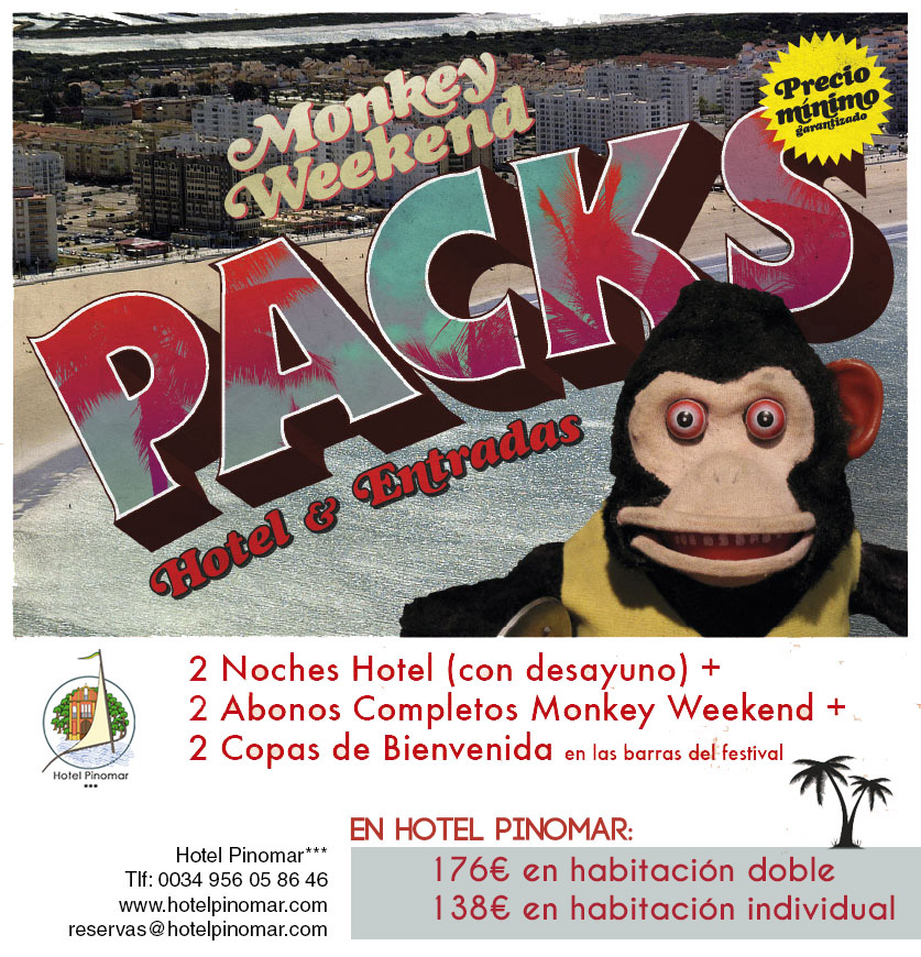 Ponemos a disposición del público del Monkey Weekend un fantástico pack que incluye dos noches en alojamiento y desayuno + Abono del Festival (Viernes 16 y Sábado 17 de junio) + Copa de bienvenida, todo a precio inmejorable para que puedas disfrutar de Monkey Weekend sin preocupación alguna y a todo confort.