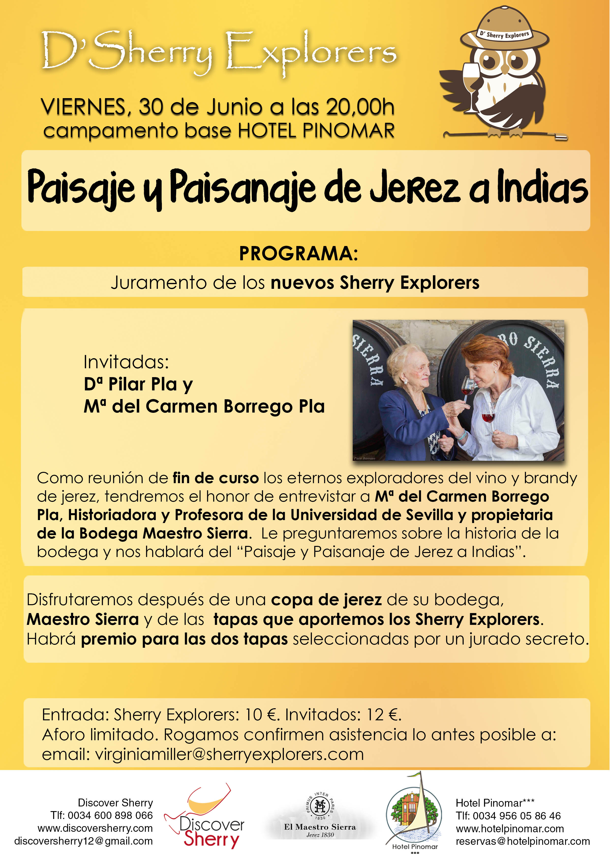 El próximo día 30 de junio organizaremos un nuevo evento de los Sherry Explorers con unas invitadas de lujo, Doña Pilar Pla y Doñá Mª del Carmen Borrego Pla. Es un verdadero honor para nosotros recibirlas en nuestro campamento base. Entrevistaremos a Doña Mª del Carmen que nos hablará de la fascinante historia de la Bodega Maestro Sierra y le preguntaremos por esos viajes de los vinos de jerez a Indias. Podremos probar algunos de sus vinos maravillosos con las tapas que los Sherry Explorers y Hotel Pinomar aportarán.