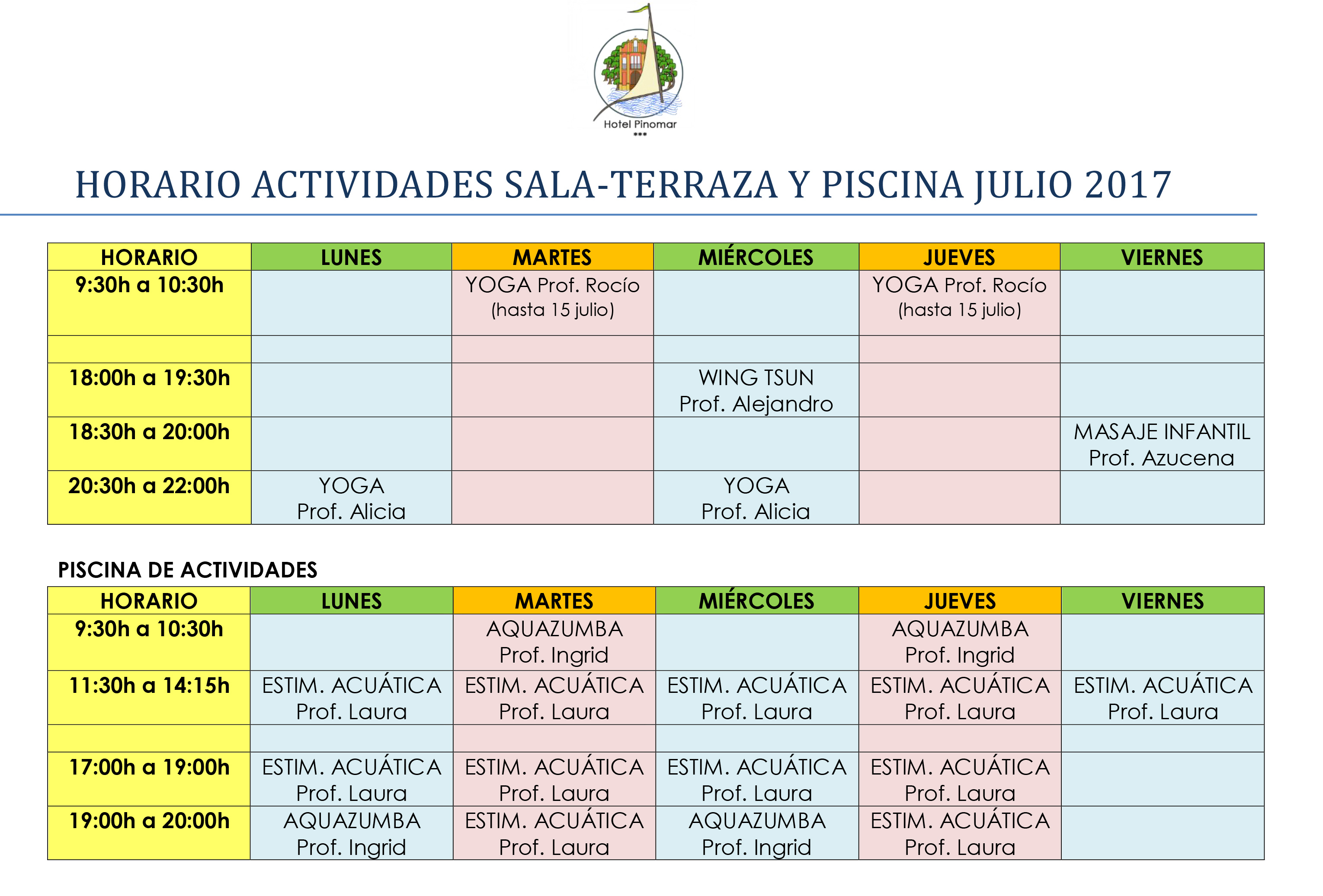 Aquí podéis ver el horario para las actividades deportivas dirigidas de nuestras instalaciones en este mes de julio. Las actividades de la sala podrán realizarse en la terraza, según condiciones atmosféricas. Las actividades acuáticas serán en nuestra piscina de actividades.