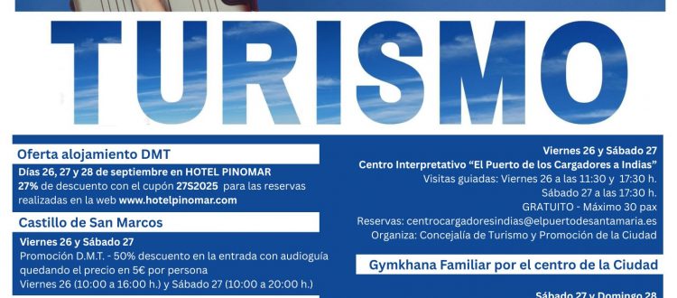 El Puerto de Santa María se prepara para conmemorar el Día Mundial del Turismo con un completo programa de actividades que se desarrollará los días 26, 27 y 28 de septiembre. Durante todo un fin de semana, la ciudad abrirá sus puertas para que visitantes y vecinos puedan descubrir su patrimonio, su historia y su riqueza cultural de una forma diferente y accesible.