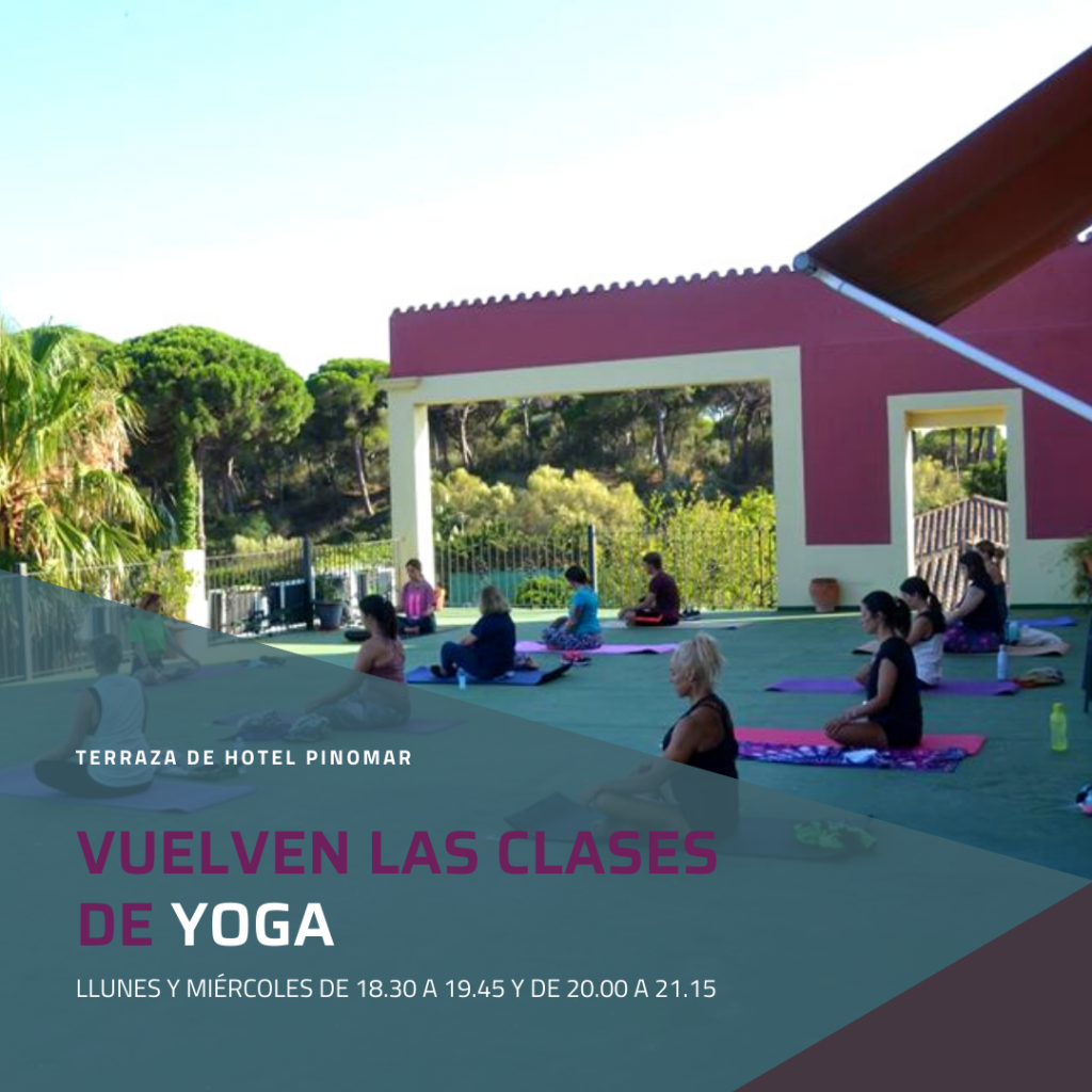 Este miércoles 16 vuelven las clases de YOGA a Pinomar. Serán en nuestra terraza los lunes y los miércoles de 18.30h a 19.45h o de 20.00h a 21.15h. Recuerda que estas clases son gratuitas para clientes alojados. Imprescindible reserva previa. ¡Te esperamos!
